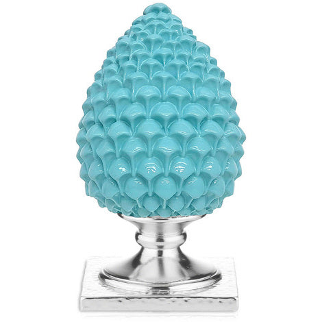 Pigna di valenti della collezione la pigna. Pigna realizzata in resina di colore tiffany con base argento. La pigna è un elemento dal profondo valore simbolico riconosciuto da diverse culture in tutto il mondo come un simbolo di buon auspicio. In quanto frutto di un albero sempreverde, che resiste alle situazioni climatiche più ostili, la pigna è infatti riconosciuta come simbolo di vita e di forza che supera anche le più terribili avversità Dimensioni: h 13R 173121TF.