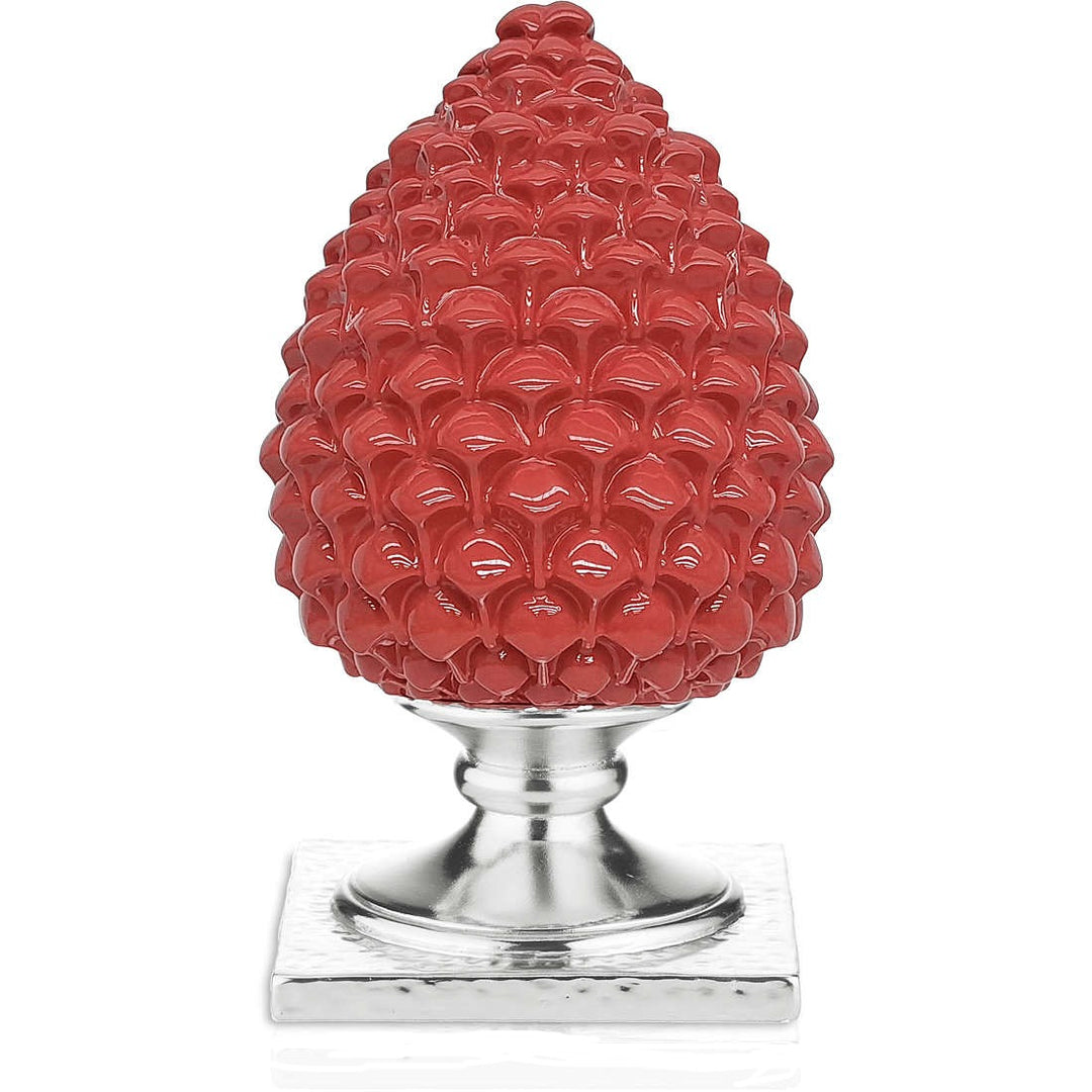 Pigna by Valenti from the Pigna collection. Pine cone made of red resin with silver base. The pine cone is an element with profound symbolic value recognized by various cultures around the world as a symbol of good omen. As the fruit of an evergreen tree, which resists the most hostile climatic situations, the pine cone is in fact recognized as a symbol of life and strength that overcomes even the most terrible adversities. Dimensions: h 19.