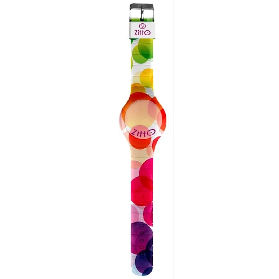 The watch has a multicolored silk-effect silicone case and strap with steel pin buckle.