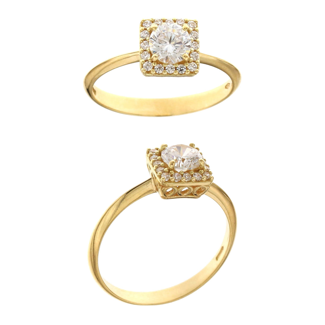 Anello in oro giallo modello solitario, con zirconi laterali, altezza montatura 0,45 cm montatura a 4 griffe - dm zircone centrale 0,40 cm - mis.14